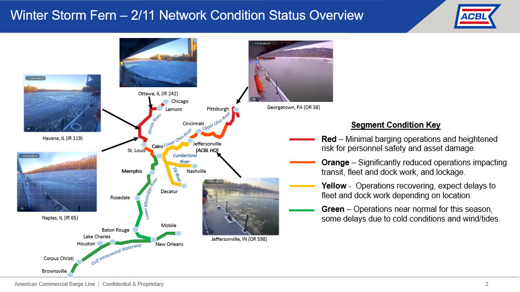 • ACBL has resumed operations on the Illinois River. Vessel movements have recommenced; however, delays should be expected as traffic normalizes, and conditions continue to improve. Northbound and Southbound timings are being planned as conditions allow, but again transits are slower than normal.